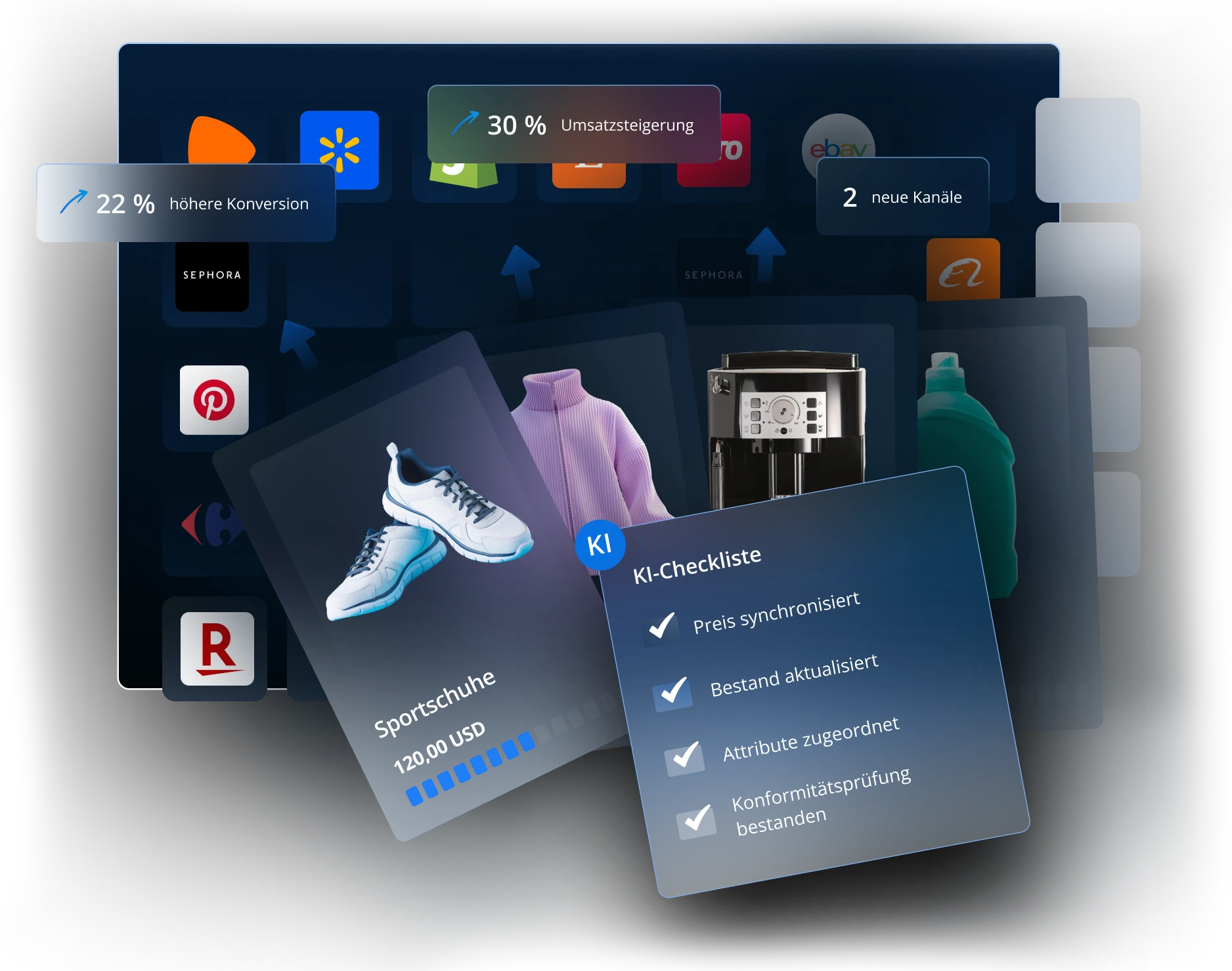 Lassen Sie Produkte auf über 1.000 Marktplätzen, sozialen Plattformen, DTC-Kanälen und bei Einzelhändlern mit KI-gesteuerter Feed-Optimierung, automatisierten Compliance-Prüfungen und integrierten Bestellabläufen listen und live schalten.