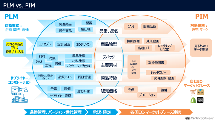 両システムは、商品情報の正確性と一貫性を保つために協力して機能します。PLM(製品ライフサイクル管理)が製品の企画開発と調達業務に重点を置き、PIMでは管理されない詳細な仕様、コスト、進捗情報を管理することに対し、PIM(商品情報管理)は販売とマーケティングに必要な情報の整理と提供を支援します。