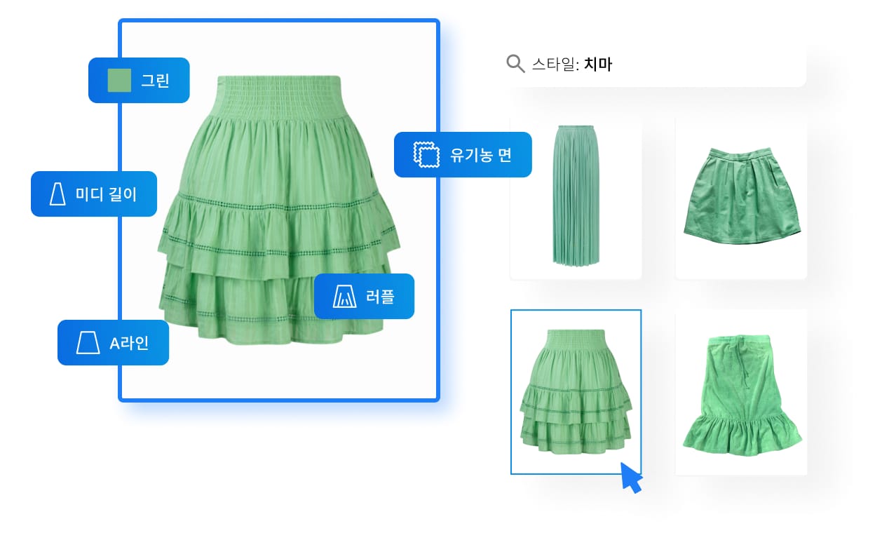 디자인 속성을 포함하고 있습니다. 예를 들어, 색상, 패턴, 소재, 실루엣, 네크라인, 신발의 앞코 및 힐 형태, 성별, 스포츠 유형, 아우터웨어, 스톤 타입 등 폭넓은 항목을 아우릅니다.