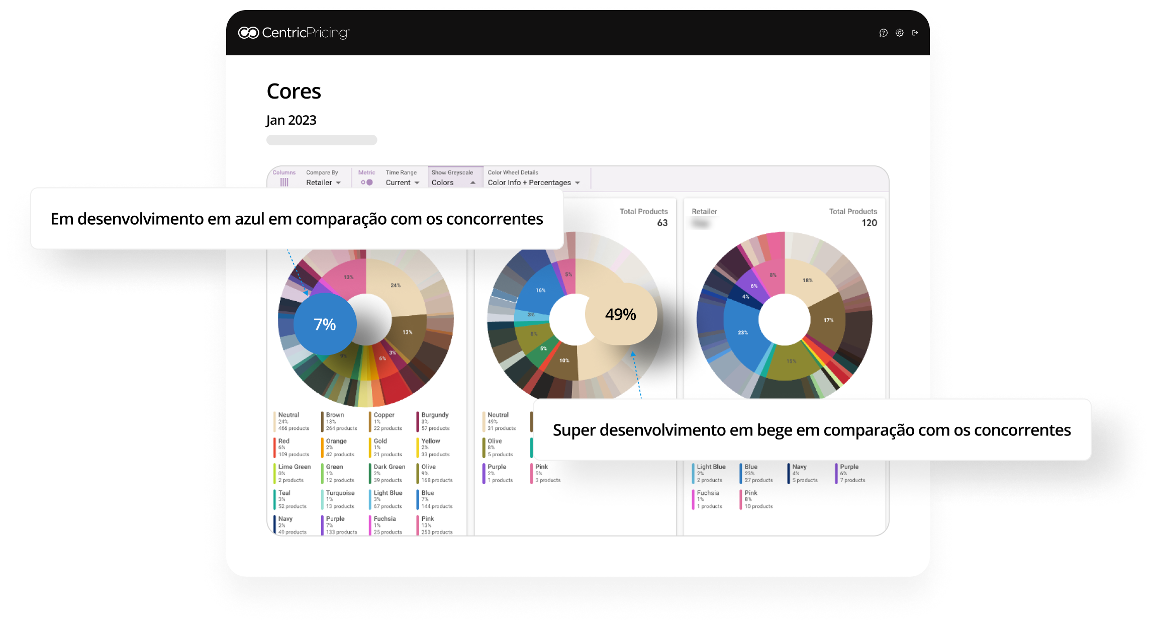 Divida os dados dos concorrentes por cor e obtenha um retrato rápido da composição de cores dos concorrentes. Esta imagem indica que pode haver um subdesenvolvimento em azul, mas um concorrente parece estar super desenvolvido em bege.