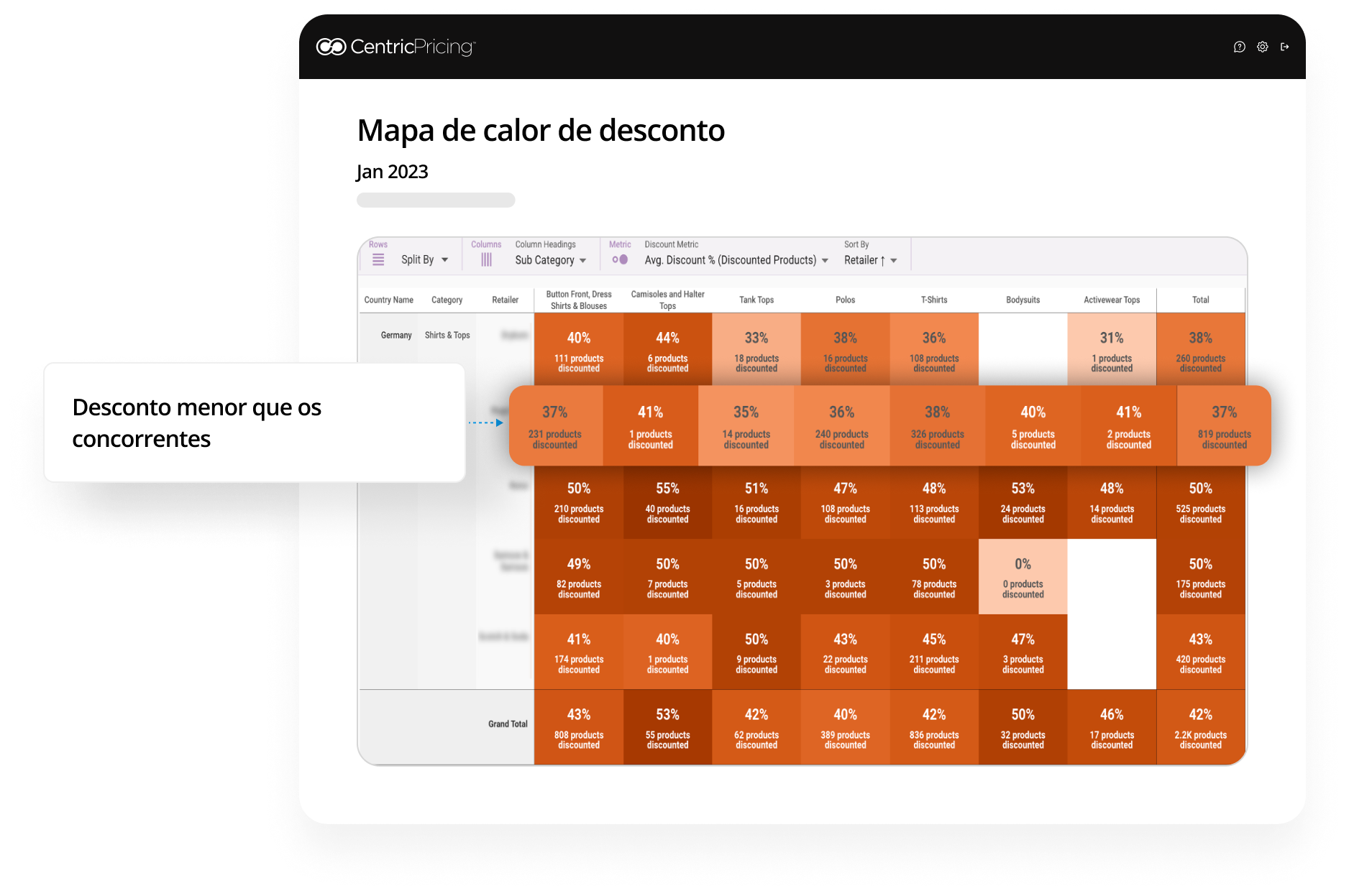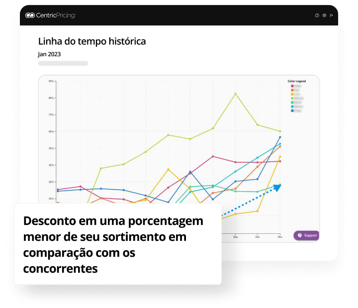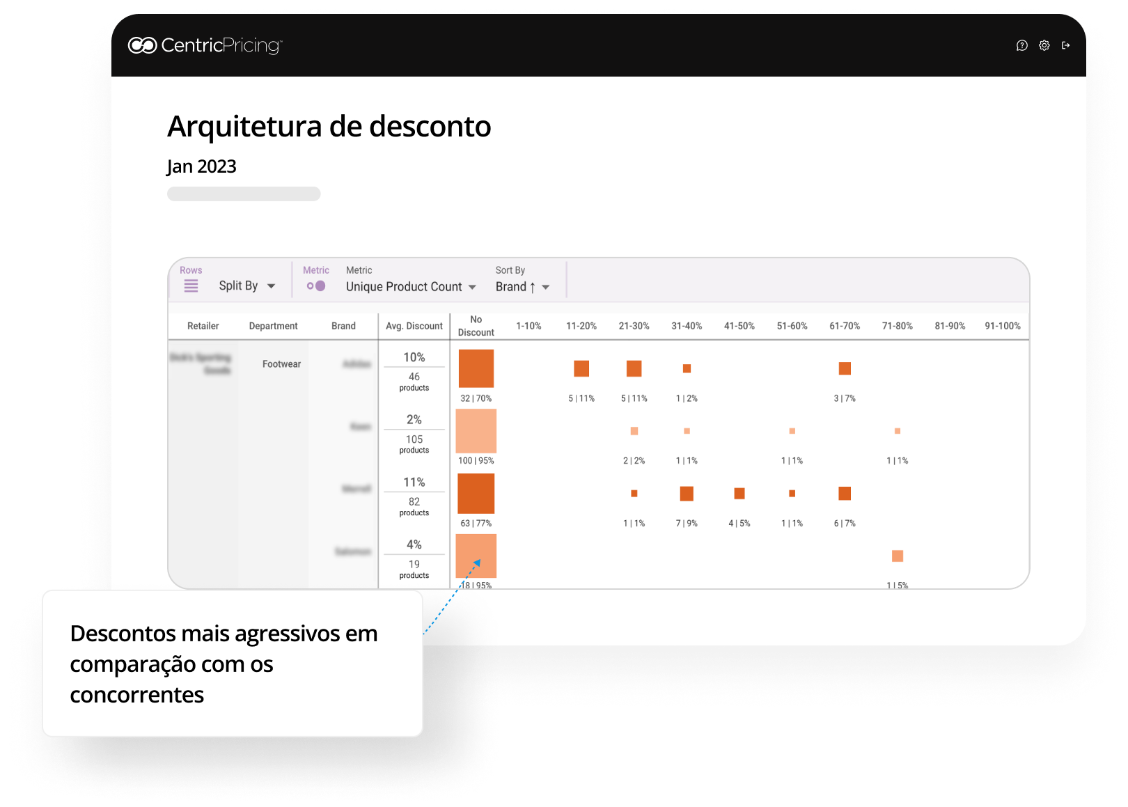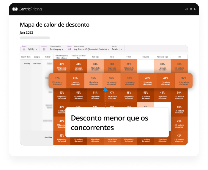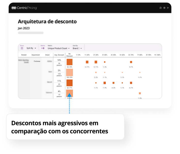 A partir do gráfico, marcas e varejistas podem descobrir sua estratégia de descontos em comparação com o mercado mais amplo. É muito agressivo ou não é atraente o suficiente? Essa marca poderia oferecer descontos mais agressivos para impulsionar as vendas de produtos de baixa rotatividade.