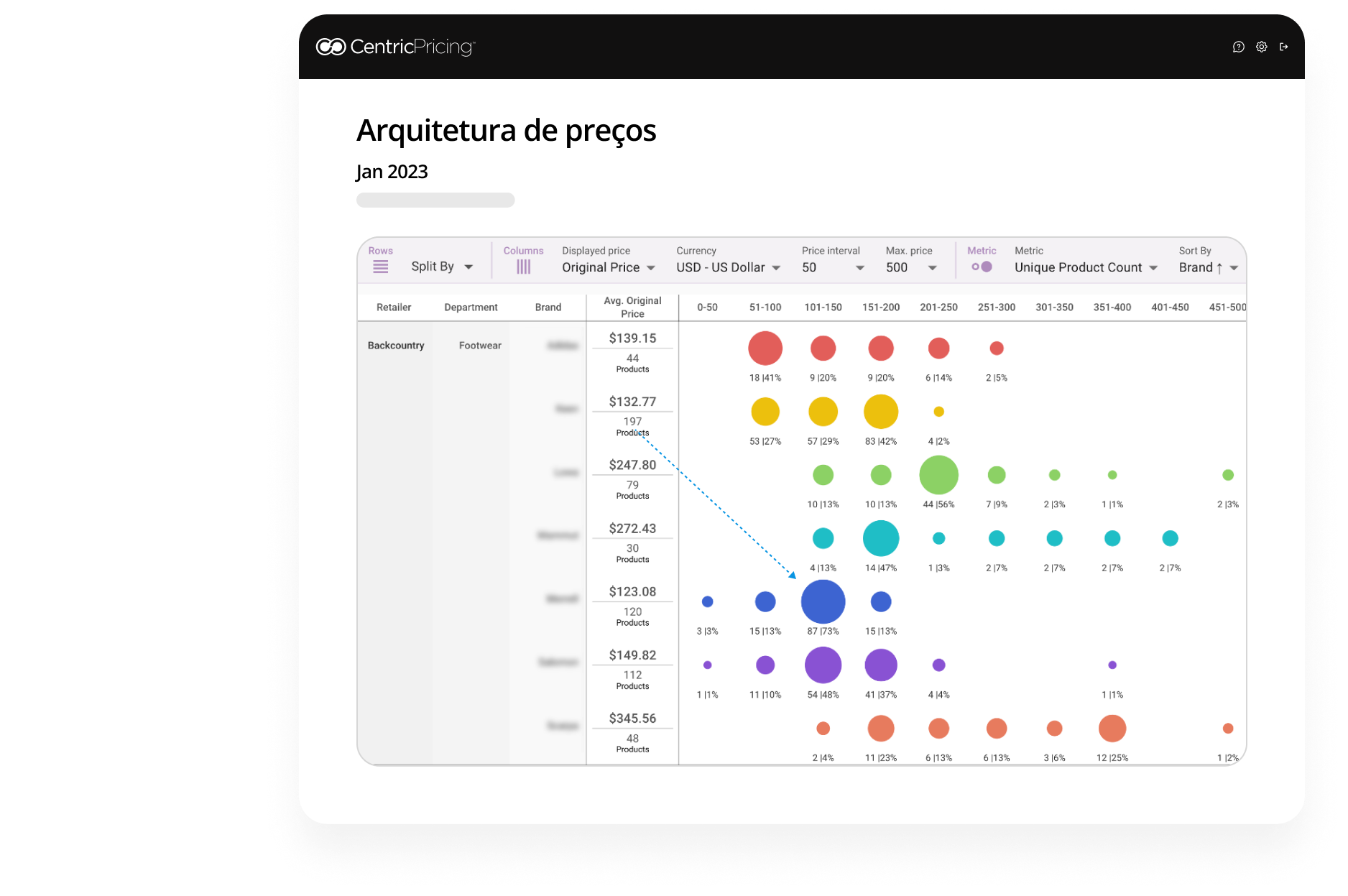 A partir desta imagem, parece que esta marca está concentrando muito estoque em um determinado ponto de preço, muito mais do que os concorrentes. Isso mostra que há espaço para expandir para preços mais altos e aumentar a margem, mas ainda assim permanecer competitivo com marcas semelhantes.